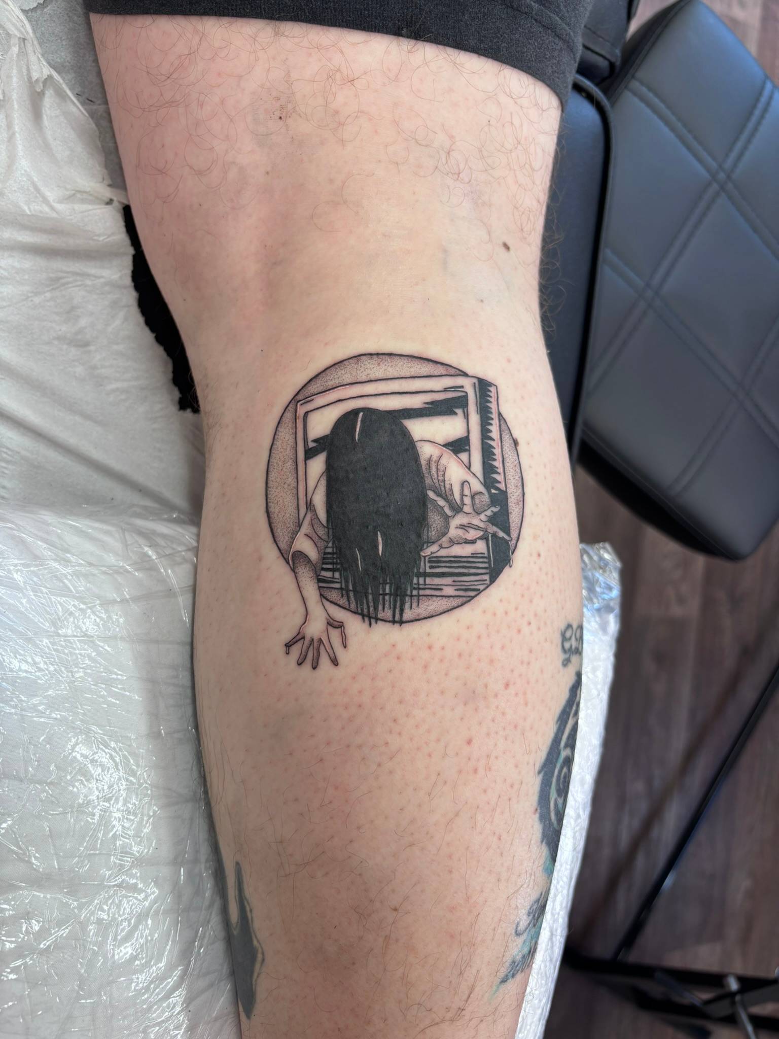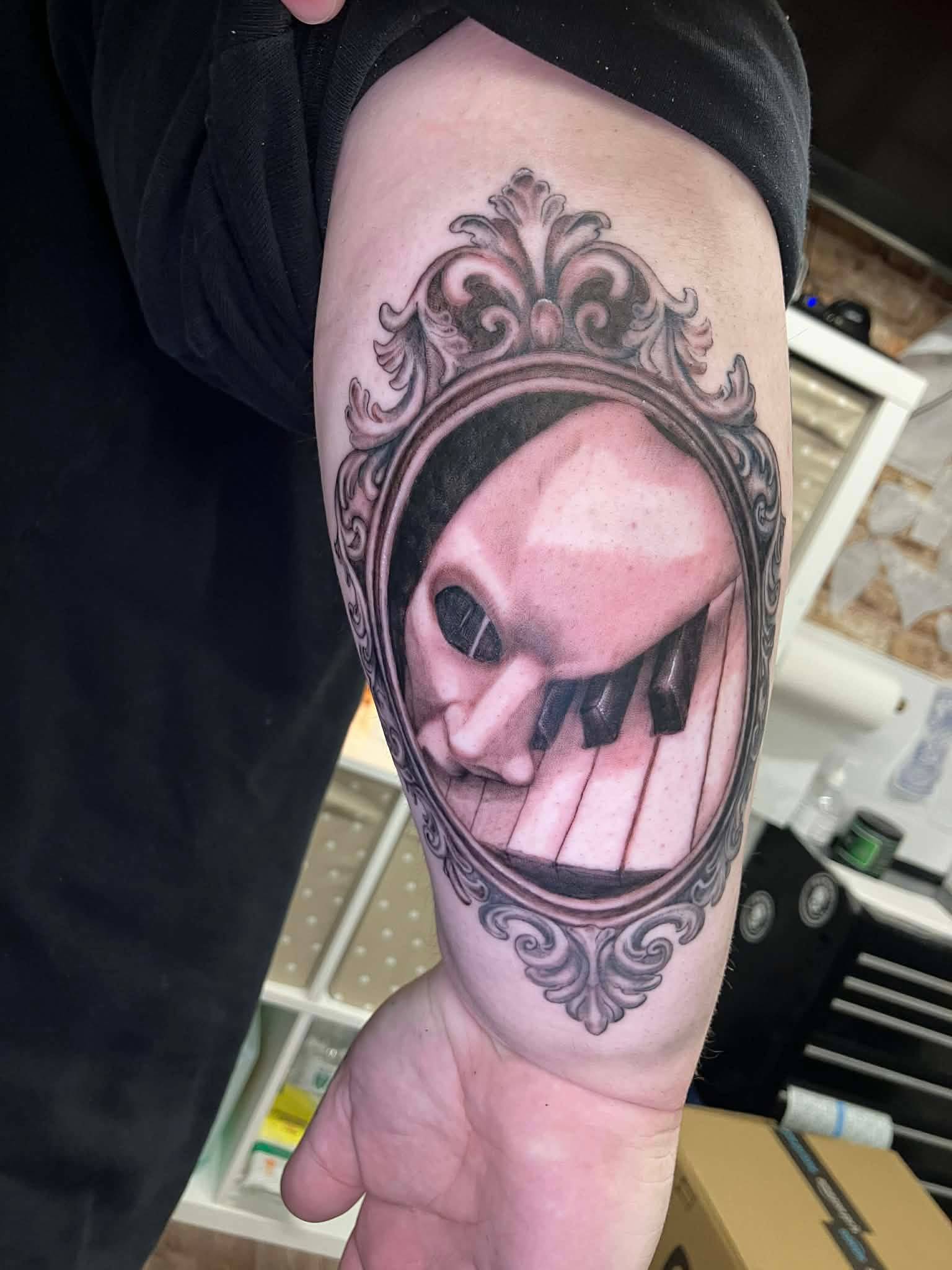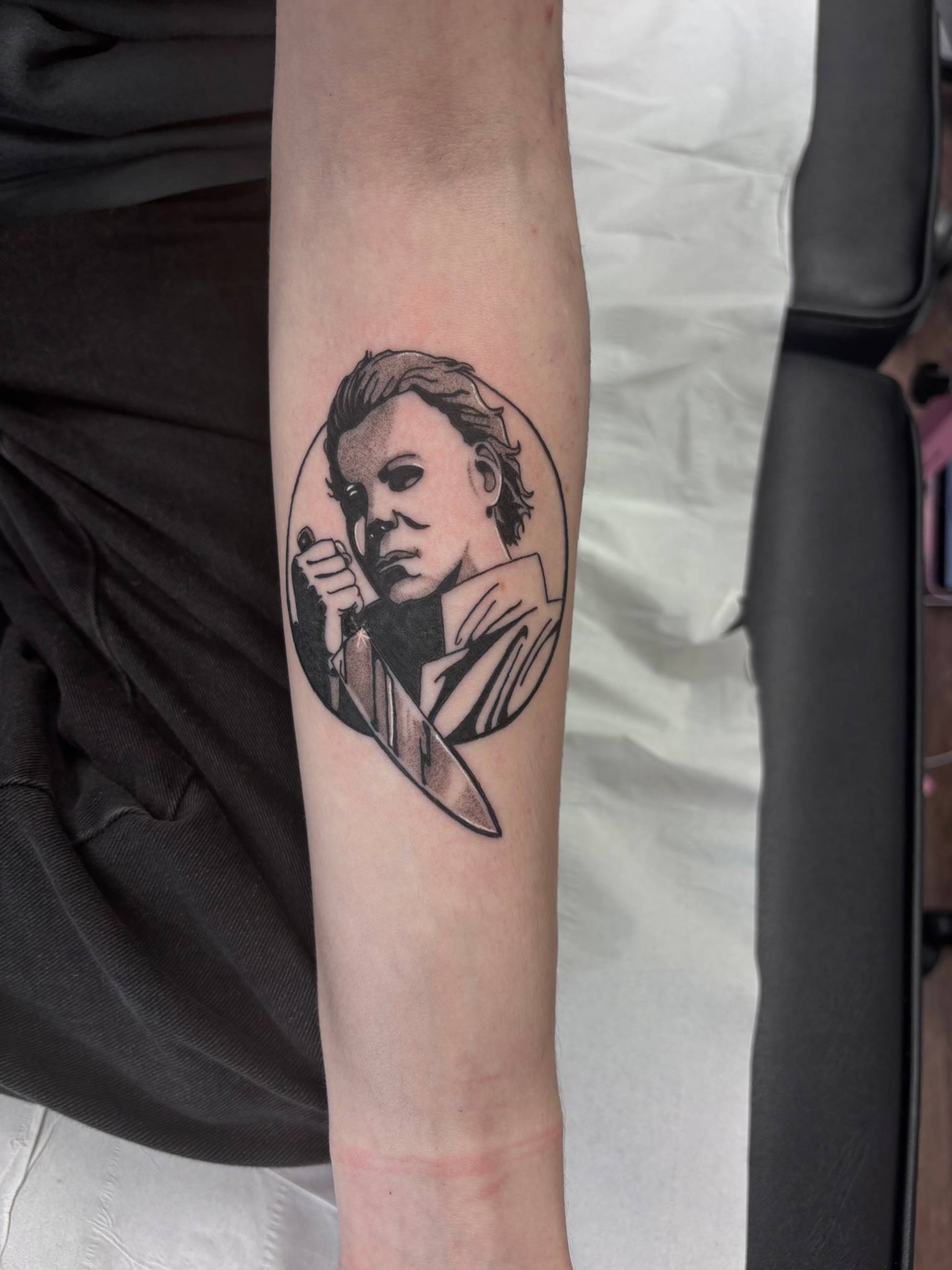 Nicole - Custom horror inspired fine line black work tattoo with soft shading -