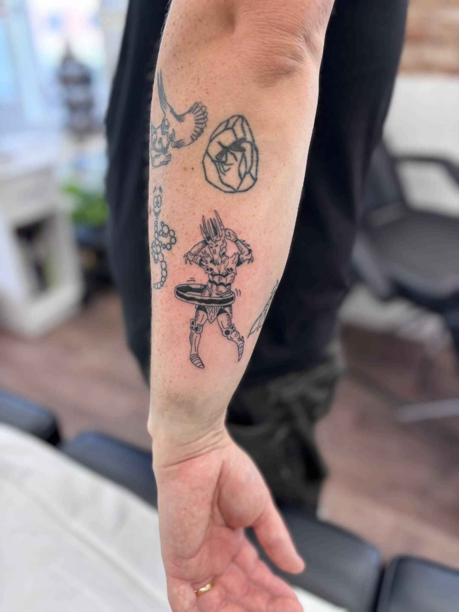 Nicole - Fine line Sauron, adding bold graphics to a patchwork arm sleeve -
