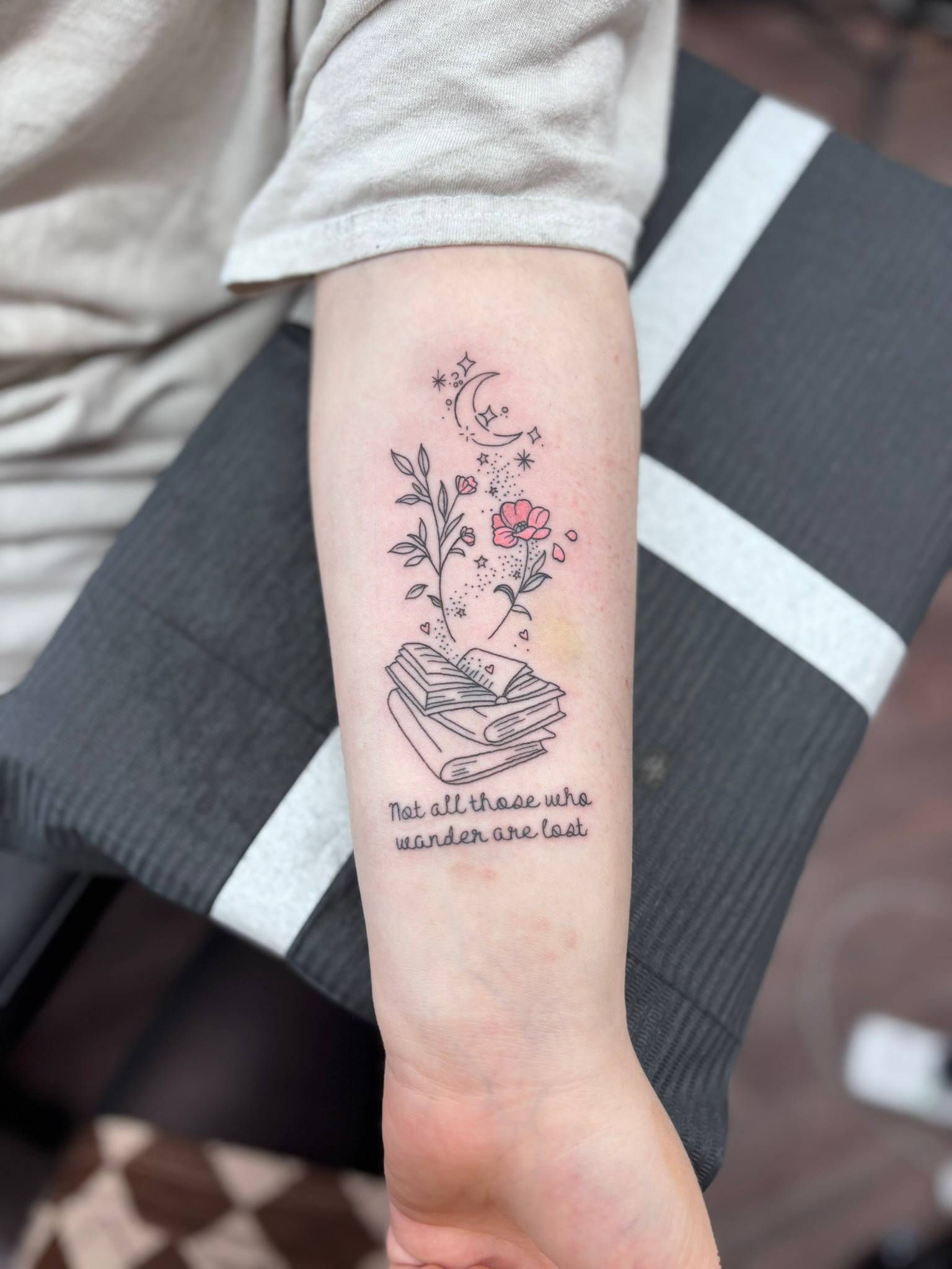 Nicole - Fine line botanical forearm tattoo with subtle ornamental and celestial detailing -