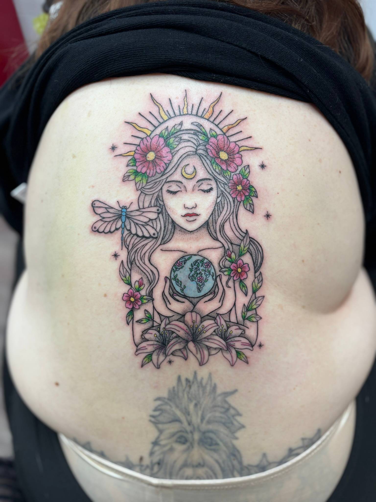 Nicole - A vibrant, illustrative back piece, blending soft colour, clean linework & gentle stippling -