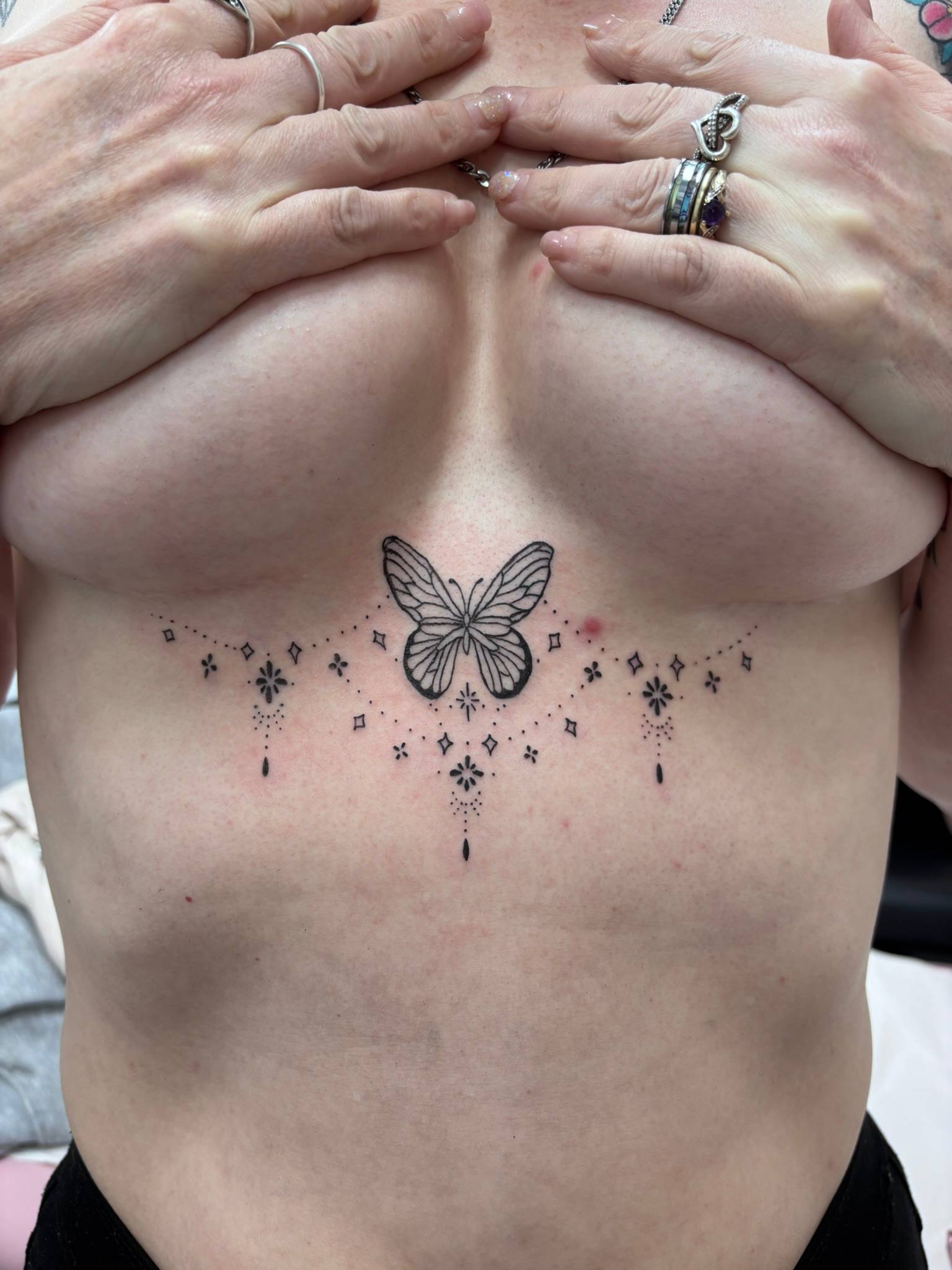 Nicole - Delicate sternum butterfly with ornamental dot work detailing -