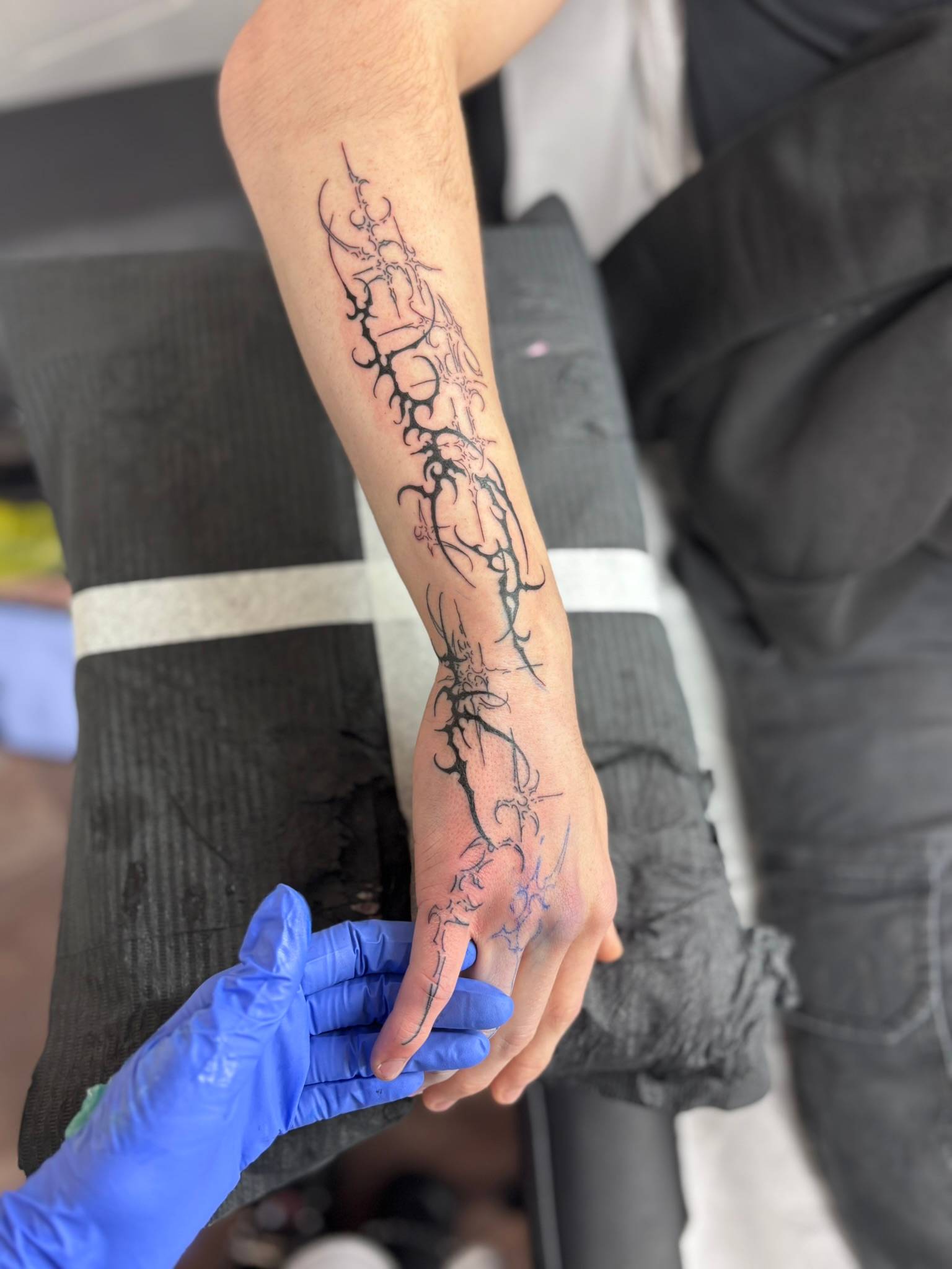Nicole - Custom fine line cybersigilism flowing from the forearm to the little finger -