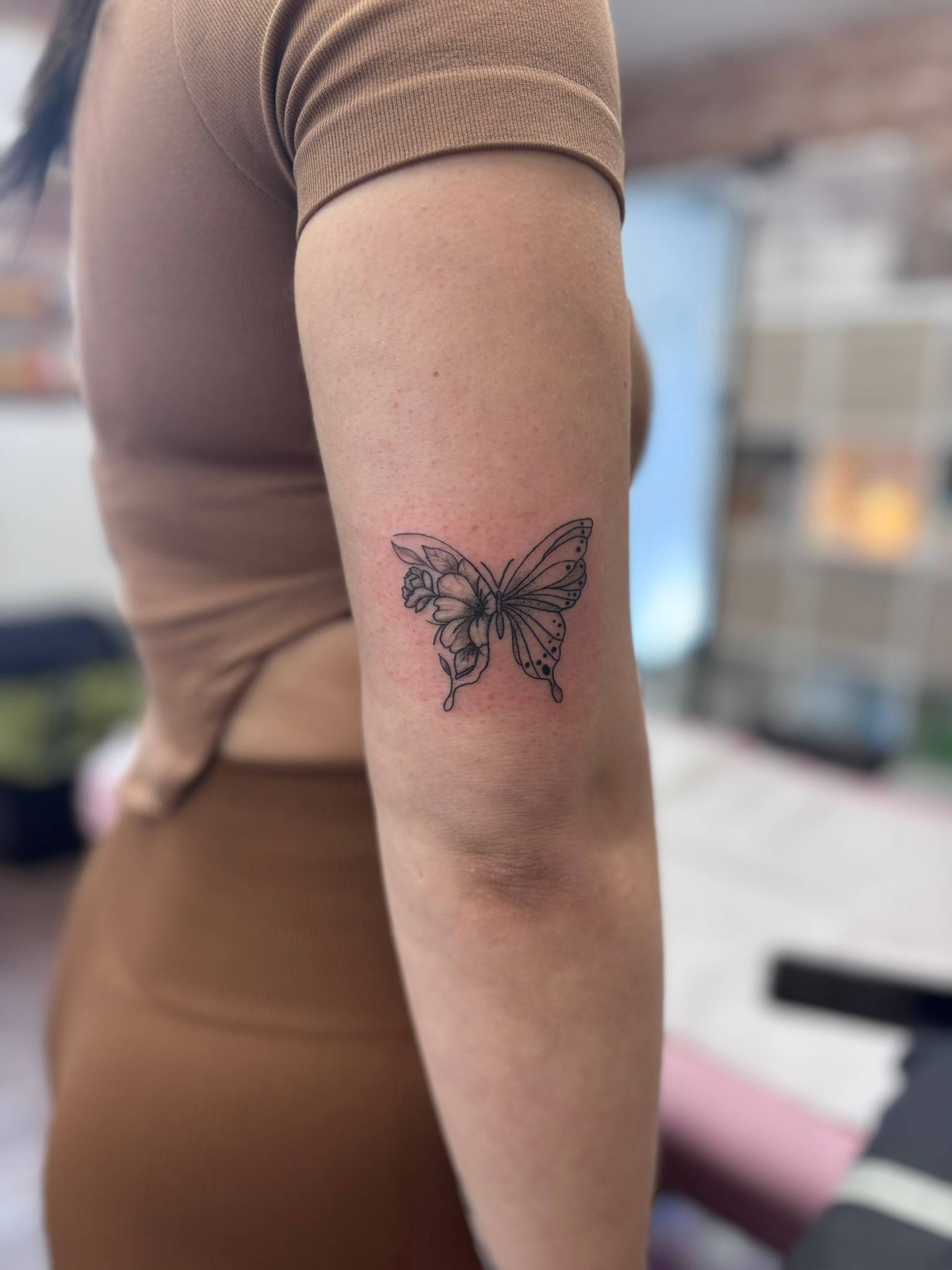 Nicole - Beautiful fine line butterfly and dot art on the lower back -