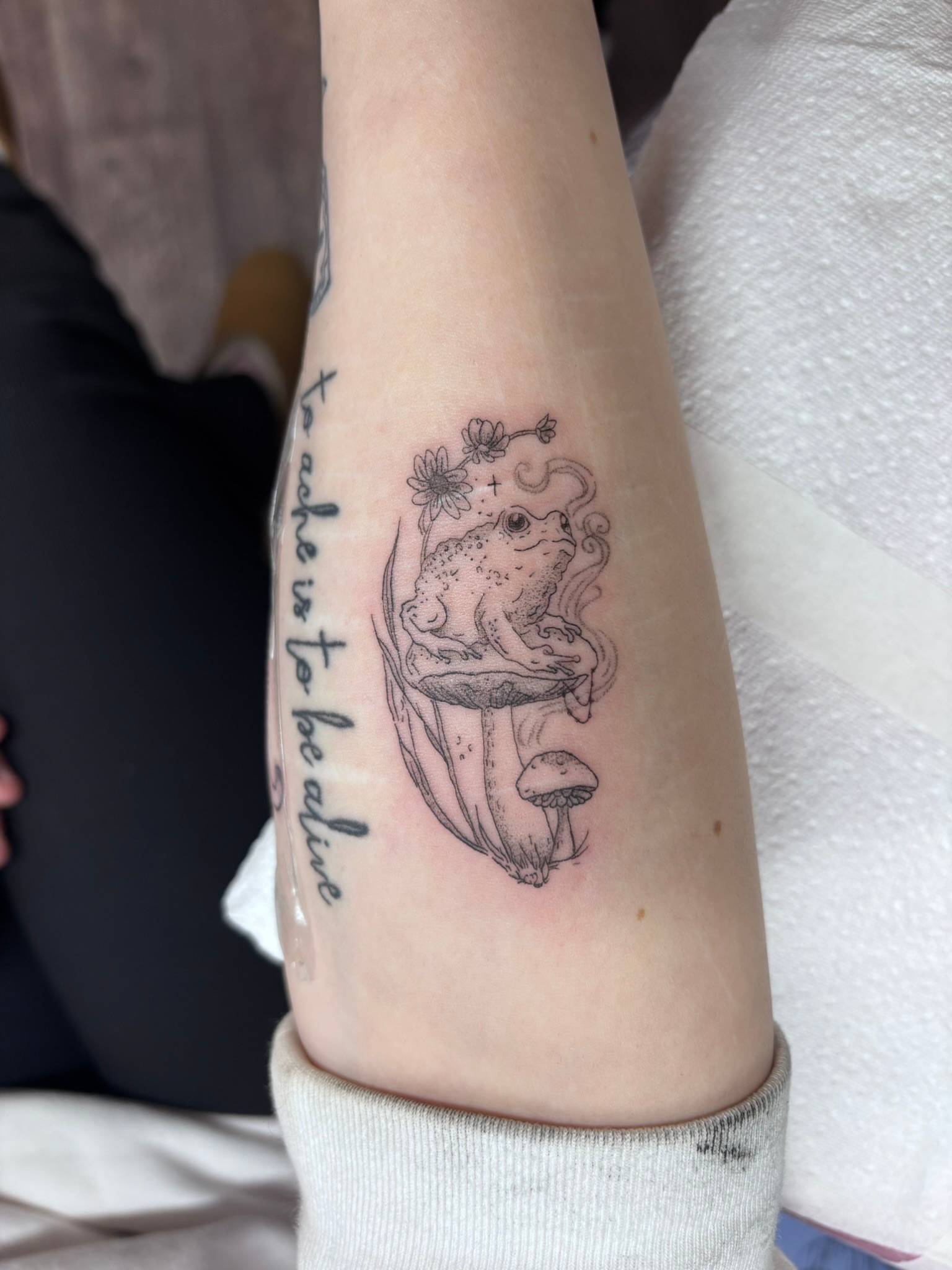 Nicole - Delicate fine line toad perched on a mushroom, finished with soft shading & tiny botanical details -