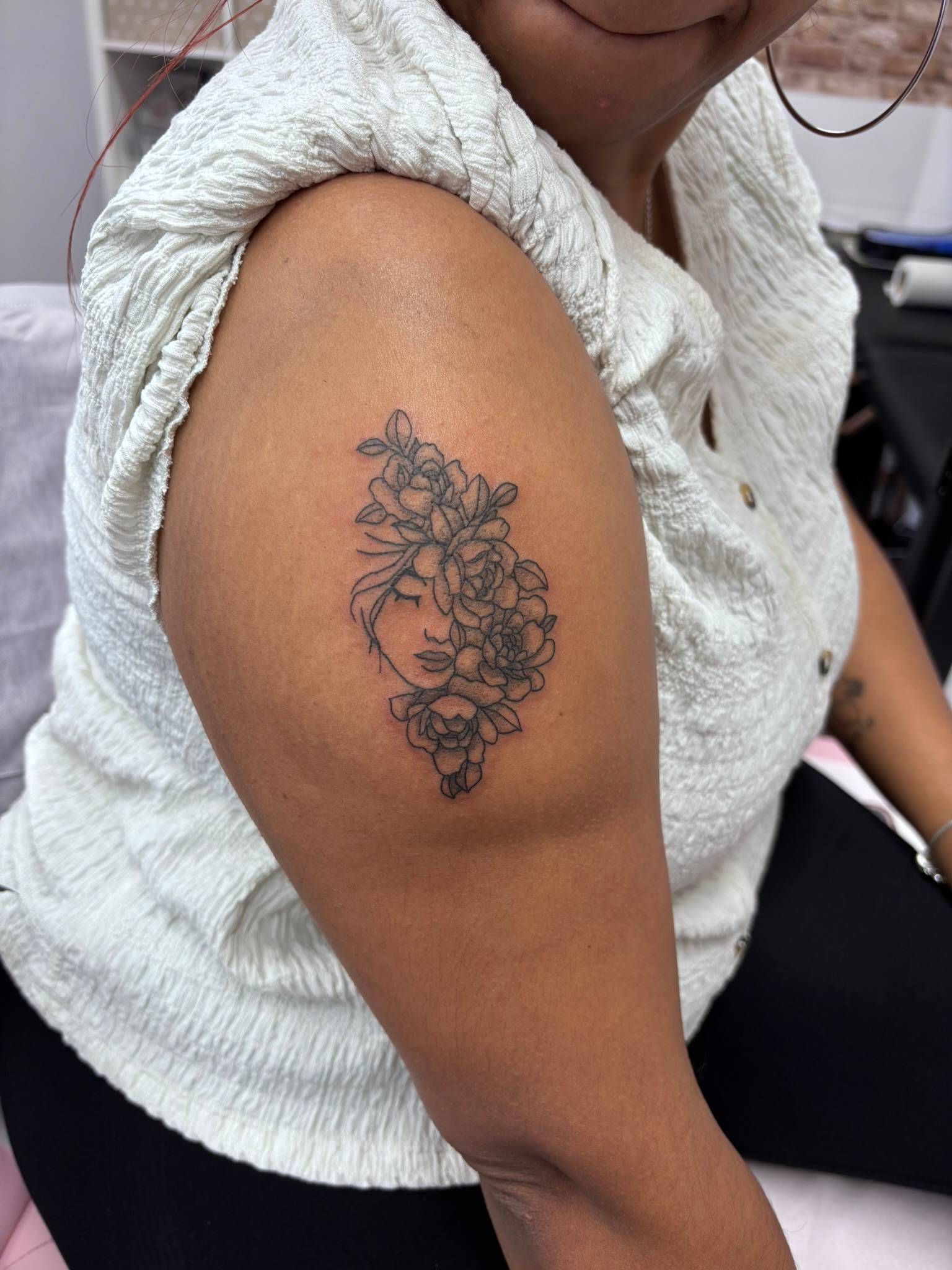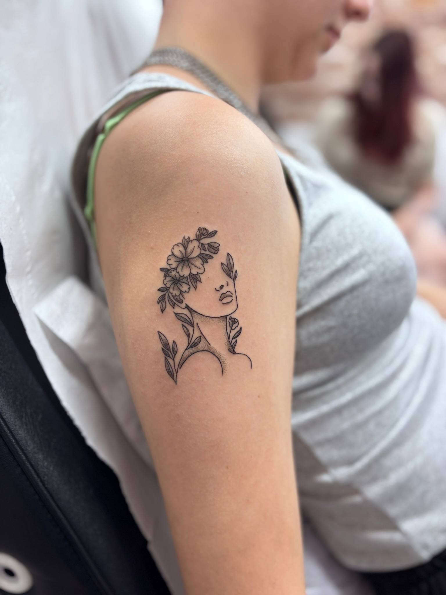 Nicole - Fine line florals gently framing a woman's face with soft shading -