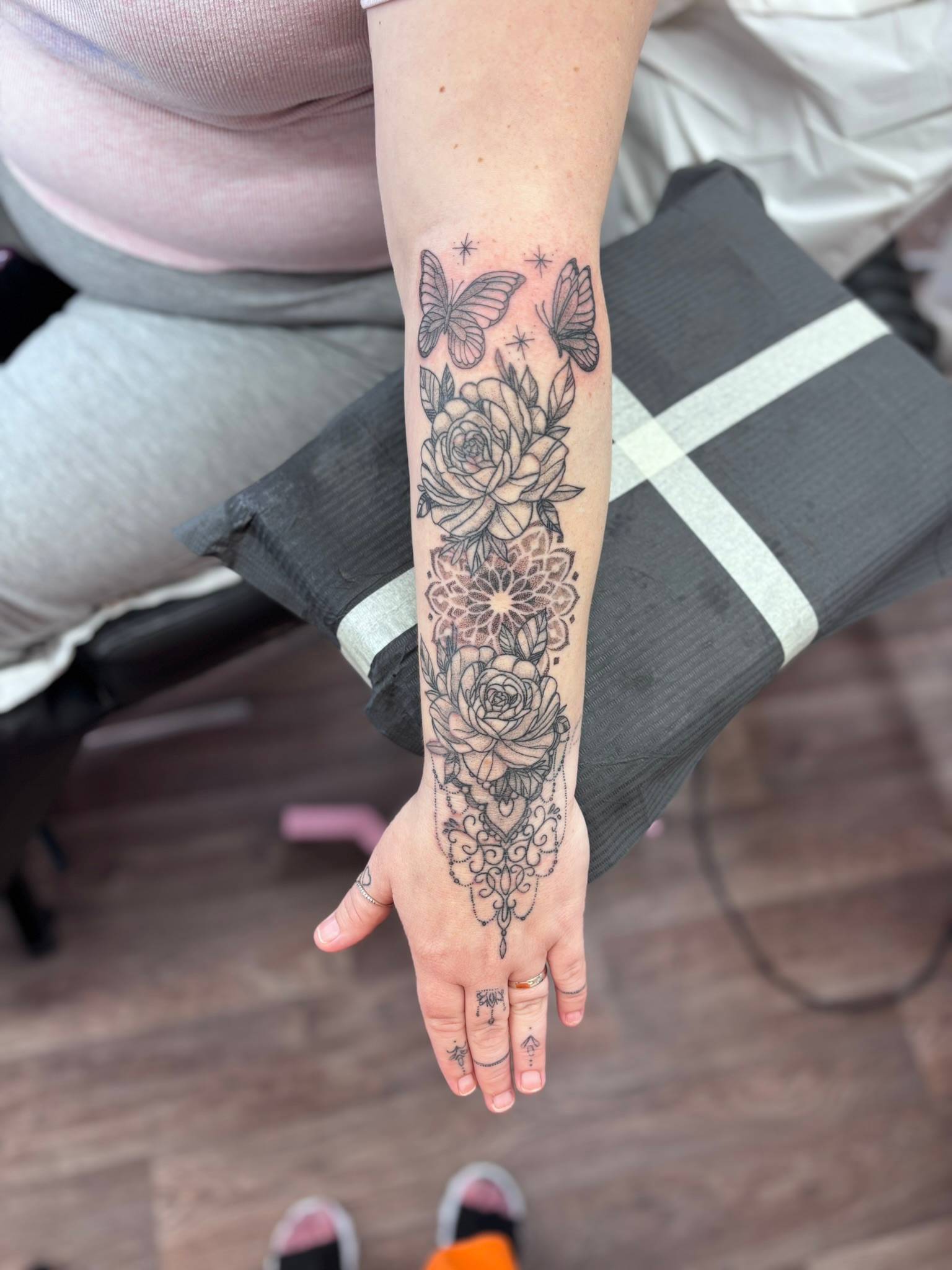 Nicole - Layered roses, mandala details and soft dot work, finished with butterflies -
