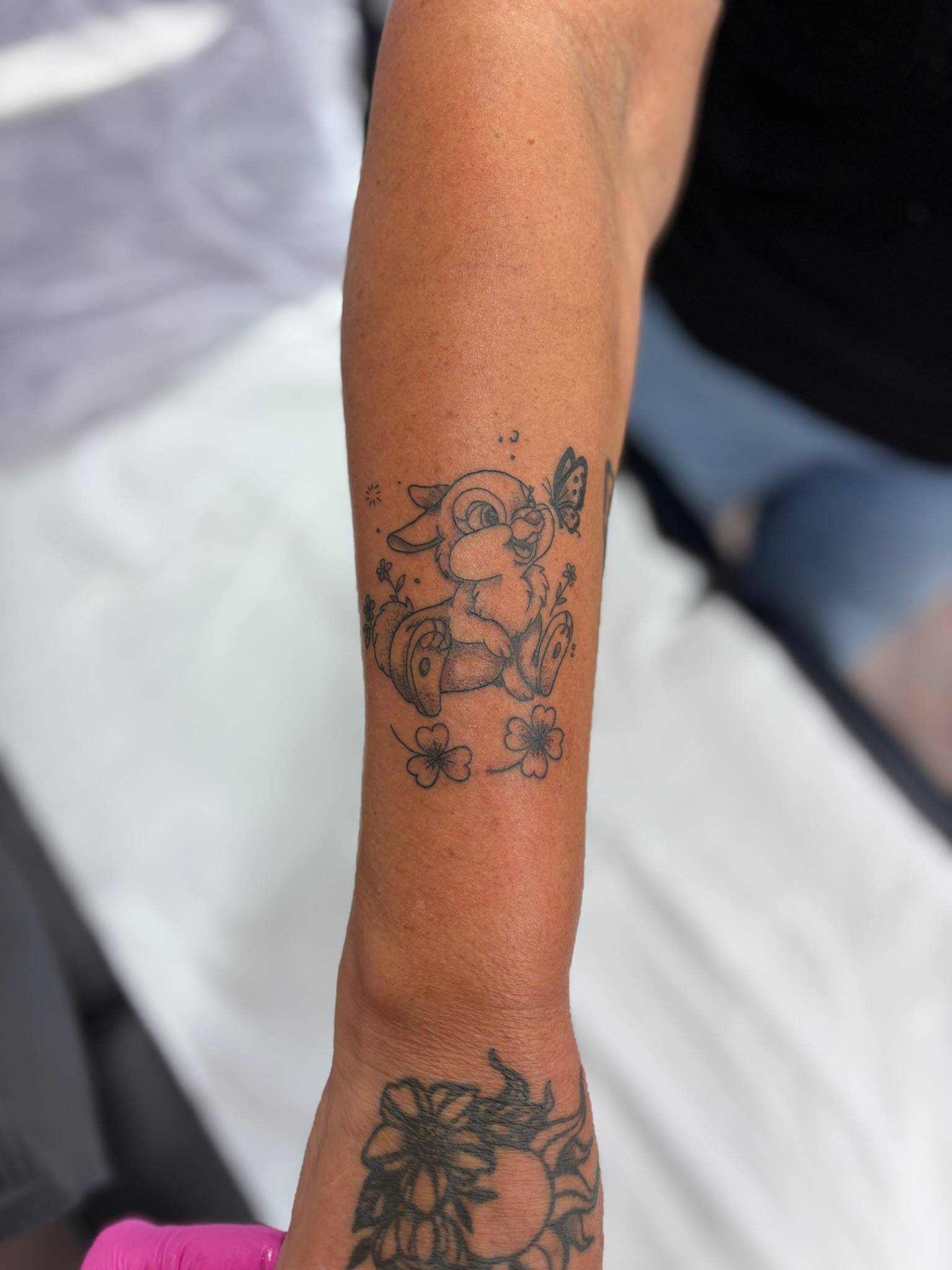 Nicole - Fine line floral rabbit on the inner forearm -