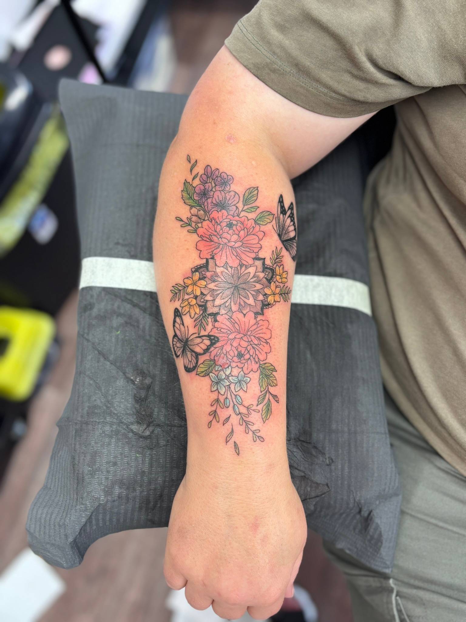 Nicole - A custom forearm tattoo, combining layered blooms, delicate leaves, butterflies & soft colour -