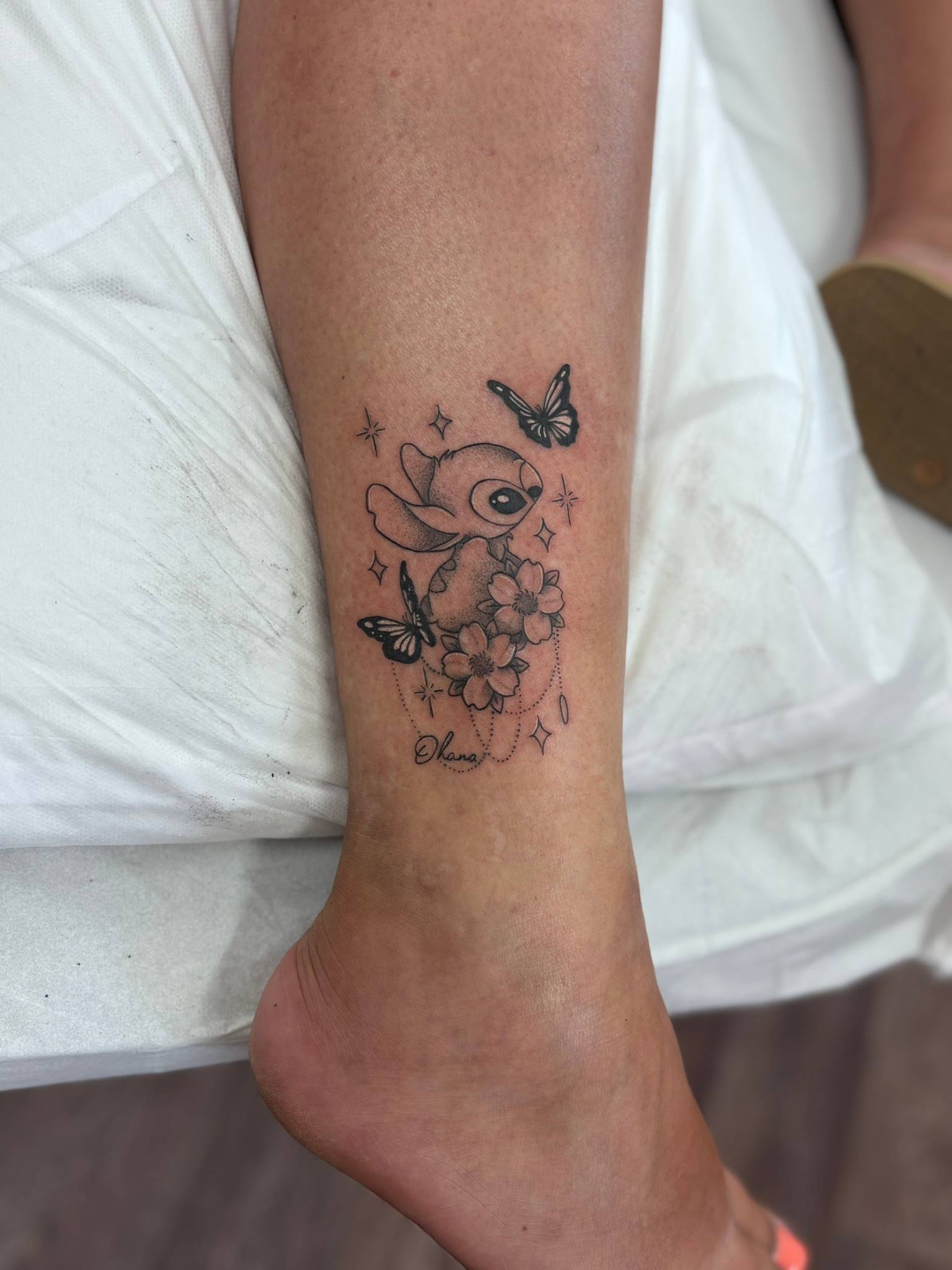 Nicole - Fine line Disney Stitch with florals, butterflies and soft shading -