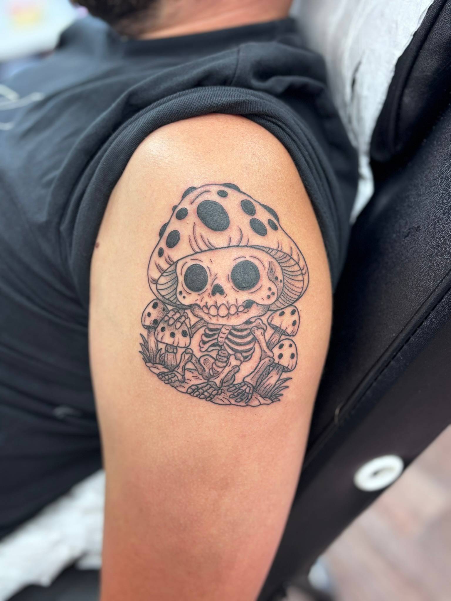 Nicole - Custom whimsical mushroom skull tattoo with fine line detail and soft shading -