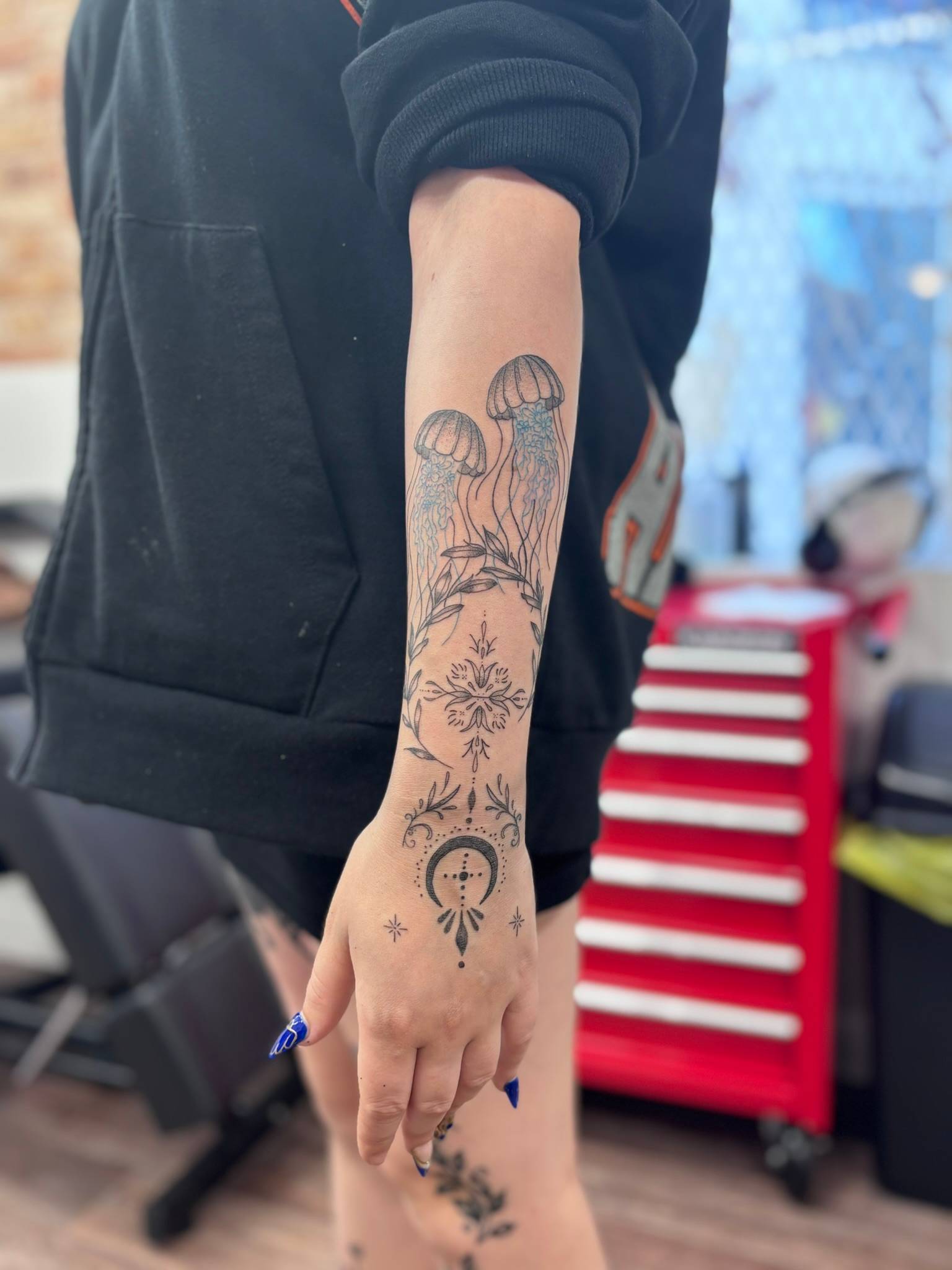 Nicole - Fine line ornamental forearm tattoo, featuring jellyfish, botanicals and celestial symbols -