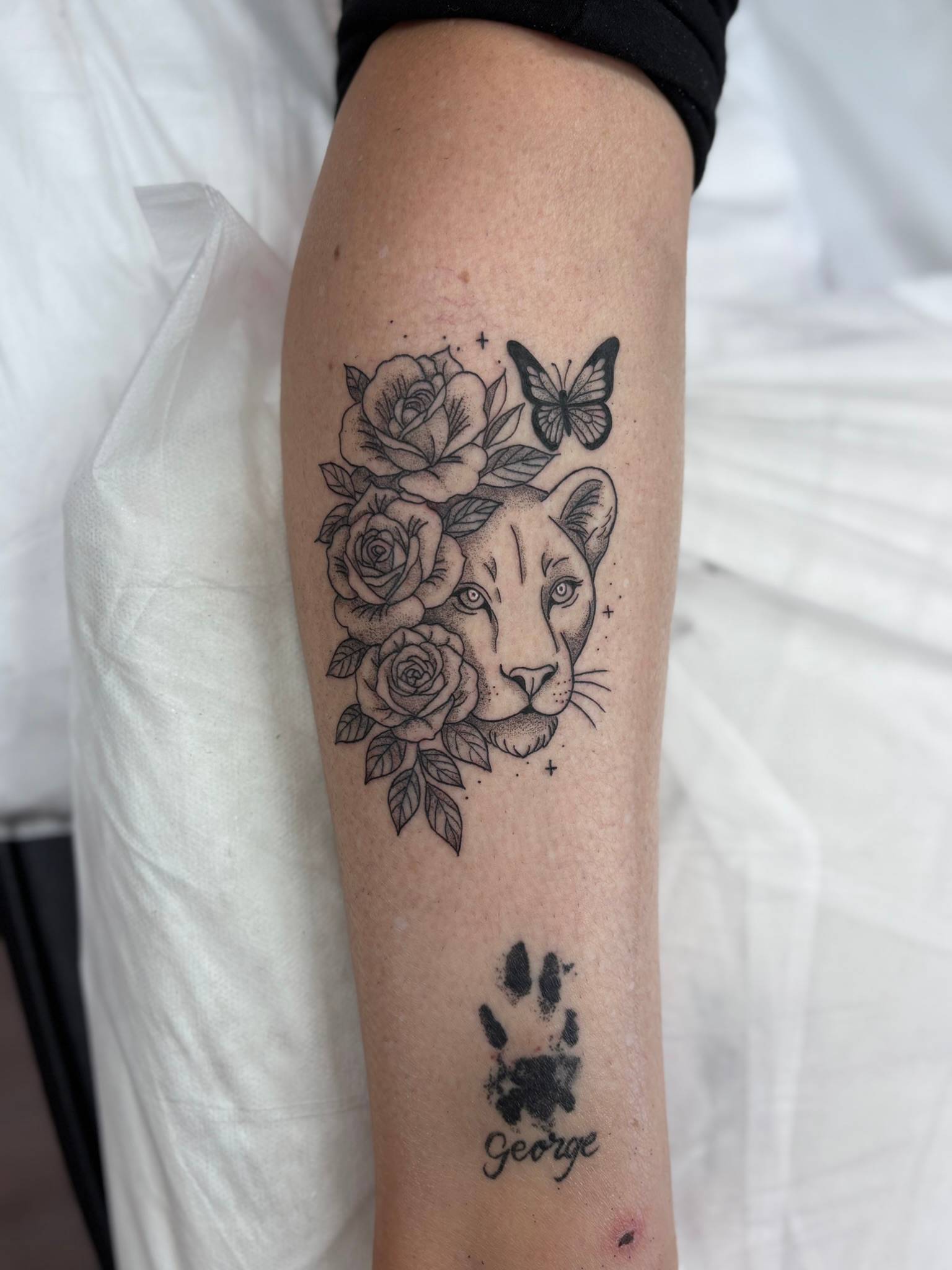 Nicole - Delicate custom lioness, framed with florals & a butterfly, symbolising courage, growth & grace -