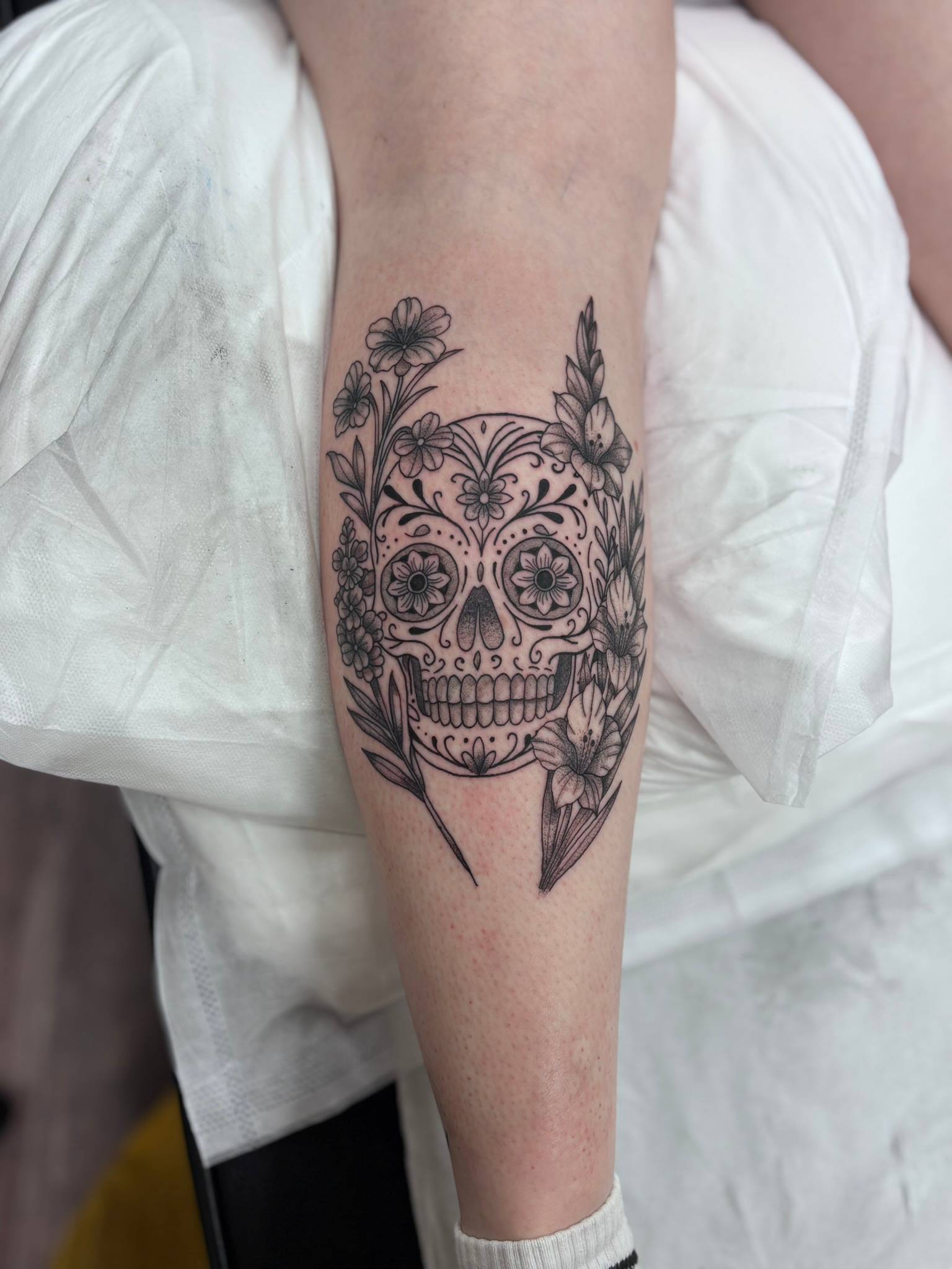 Nicole - Custom sugar skull framed with delicate florals and fine linework -