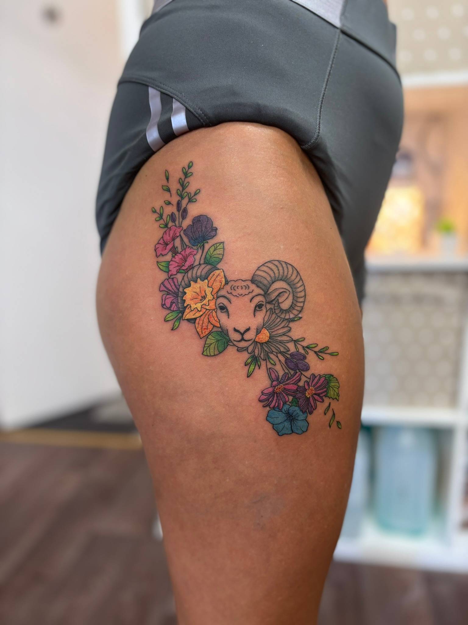 Nicole - Colourful Ram surrounded by family birth flowers. Vibrant and bold fine line -